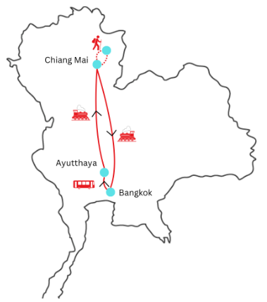 - Bangkok - Ayutthaya - Hilltribe Village - Chiang Mai - Bangkok